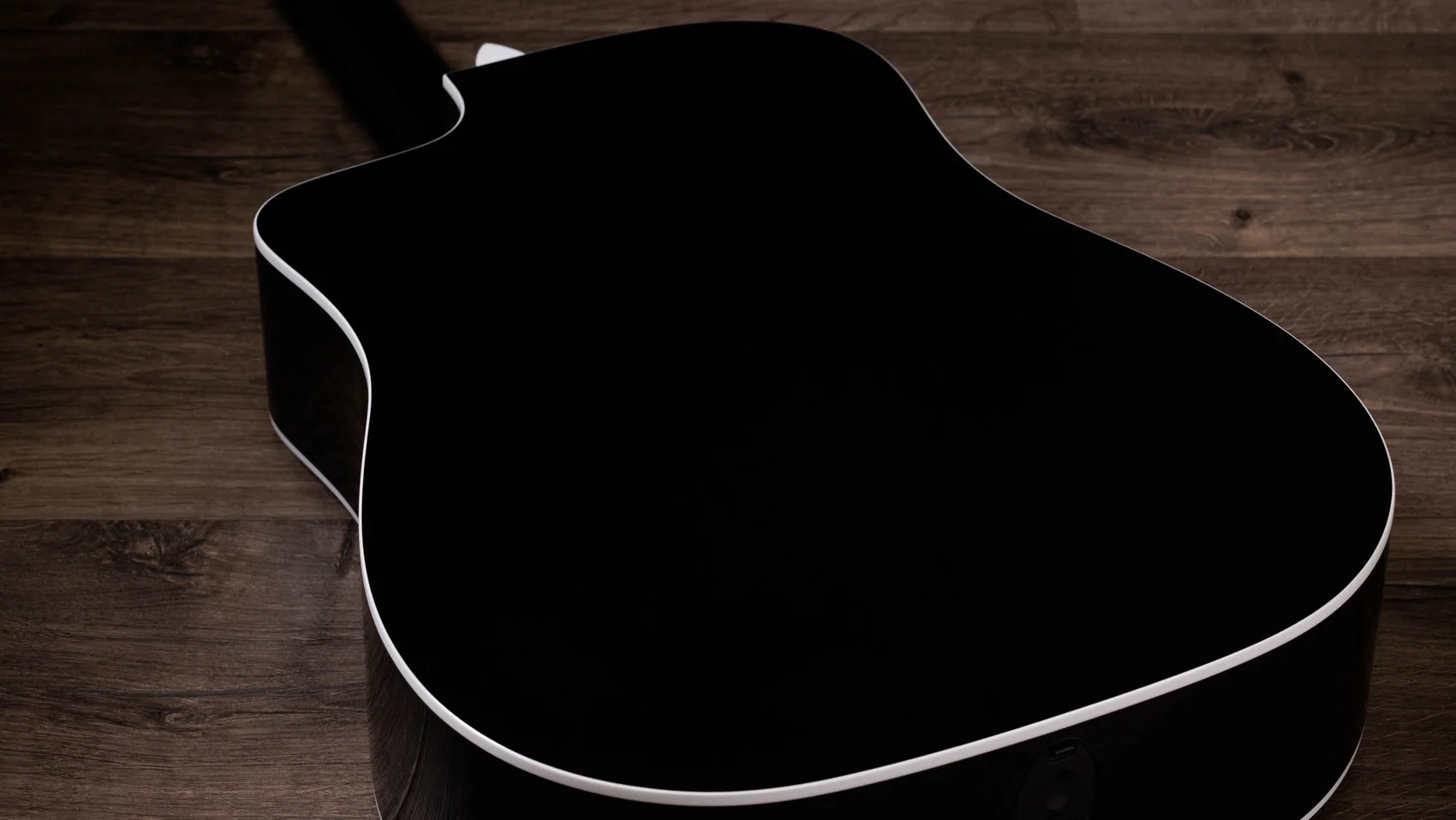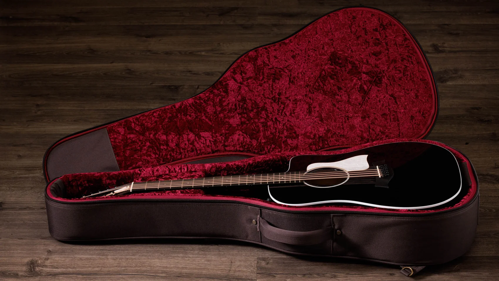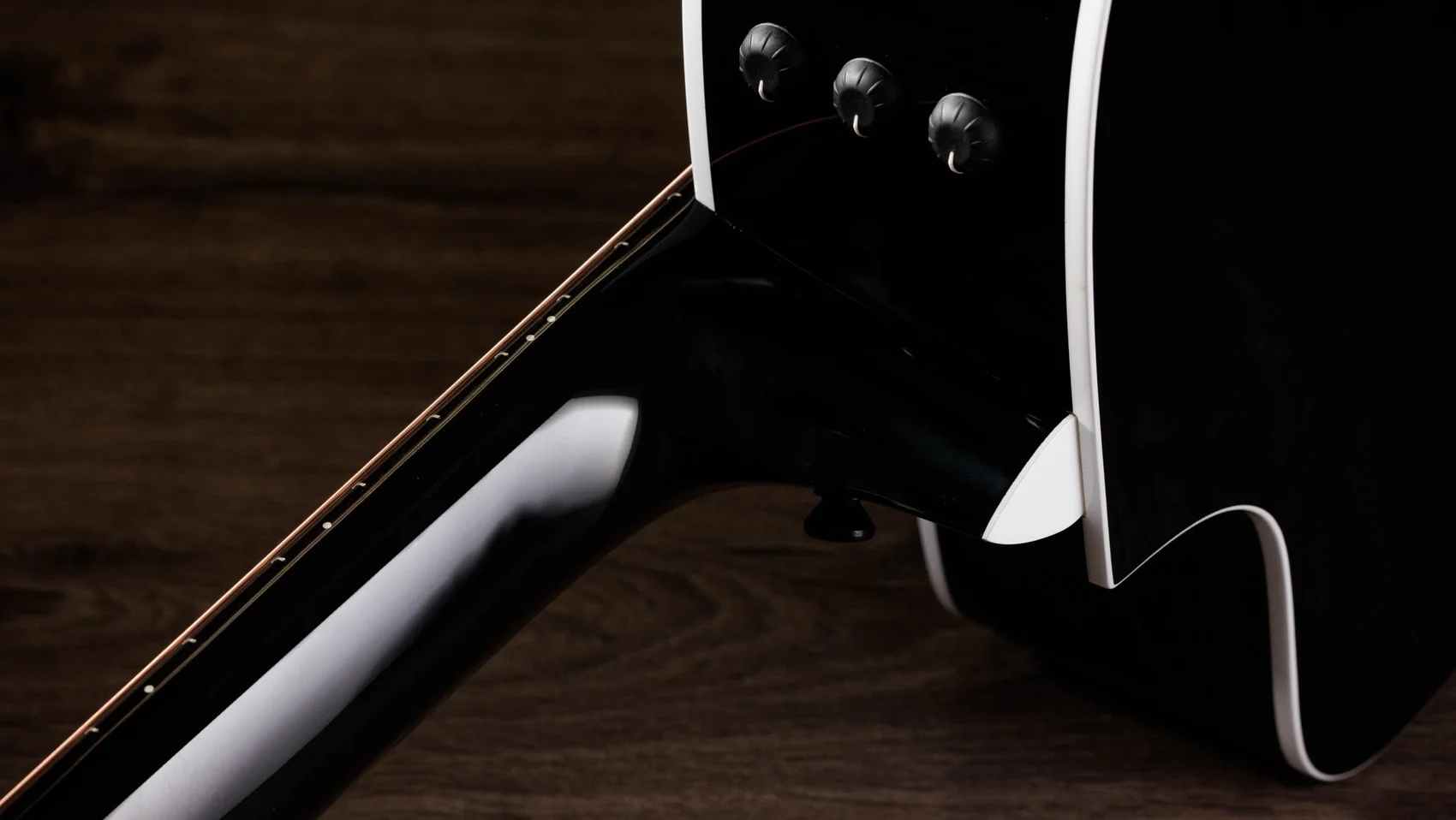 Entre sus detalles estéticos se encuentran un acabado negro brillante con golpeador y cubierta del alma en perla sintética, clavijas de afinación en negro satinado, fileteado blanco e incrustaciones tradicionales de puntos en el diapasón. La electrónica ES2 integrada garantiza un sonido limpio en situaciones amplificadas, y el AeroCase incluido ofrece toda la protección de un estuche rígido con solo un tercio del peso."