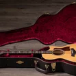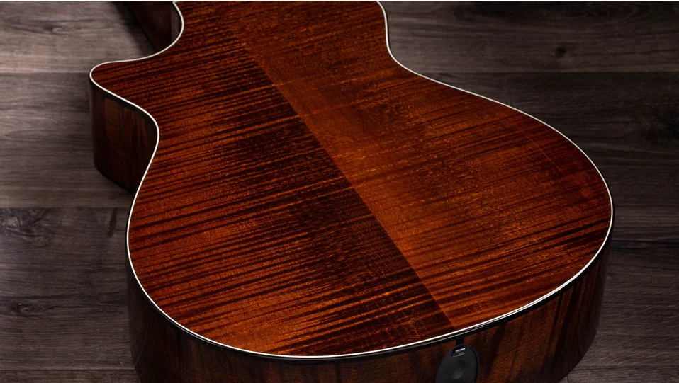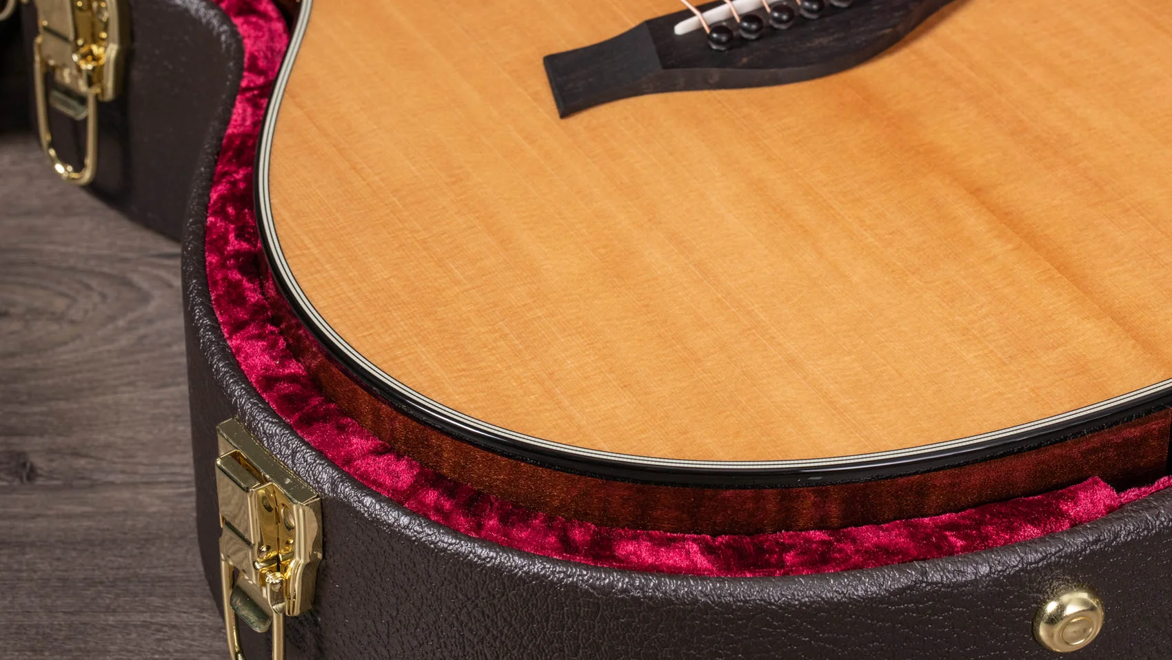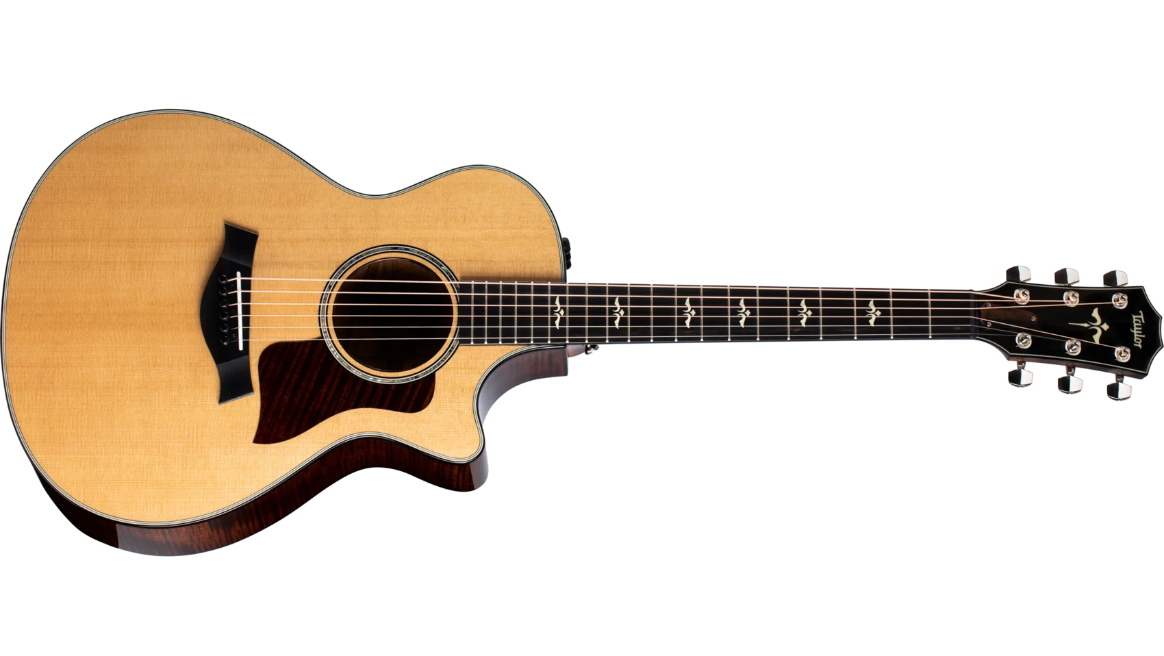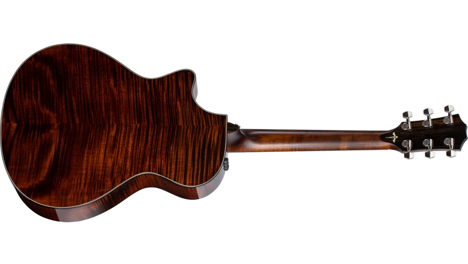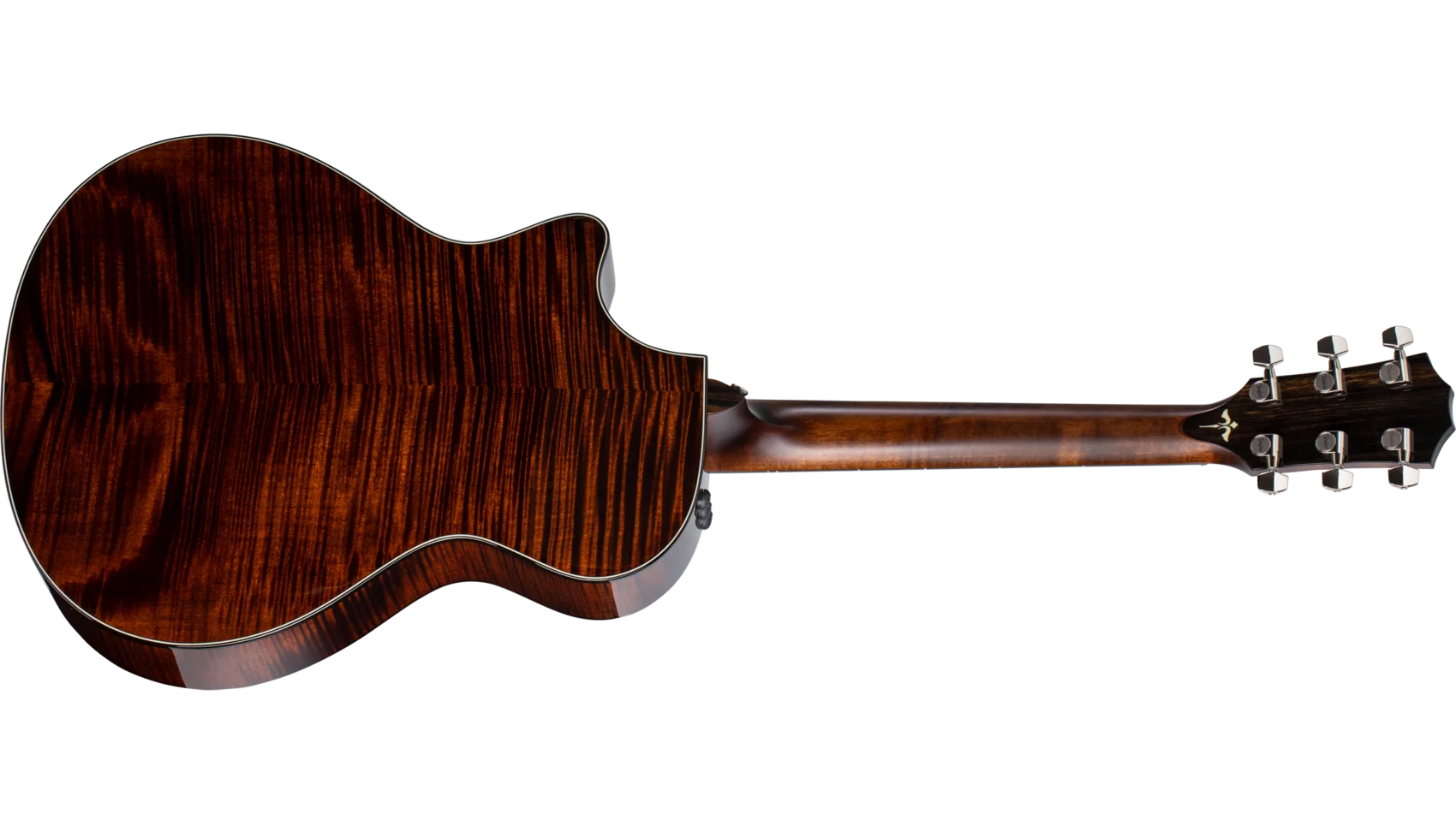 Our cutaway maple/spruce Grand Concert has been revoiced to be richer, warmer and more complex, adding extra depth to the Grand Concert body’s natural clarity and top-end chime. Tone-enhancing strokes include a new back bracing profile, a torrefied (specially roasted) top that yields wonderfully aged tonal character, protein glues that optimize the tonal transfer, and an ultra-thin gloss finish to enhance the acoustic resonance. Together with a hand-friendly short-scale neck, the 612ce sounds and plays like a dream. A hand-rubbed “Brown Sugar” stain on the back and sides gives maple’s striking figure a beautiful violin-hued appearance. Featured appointments include new grained ivoroid Wings fretboard inlays, an inlaid ebony backstrap, ebony binding with grained ivoroid purfling, an ebony/grained ivoroid rosette, and a stained maple pickguard, with Taylor’s stage-ready Expression System® 2 pickup onboard.