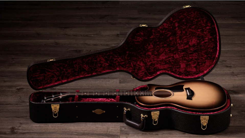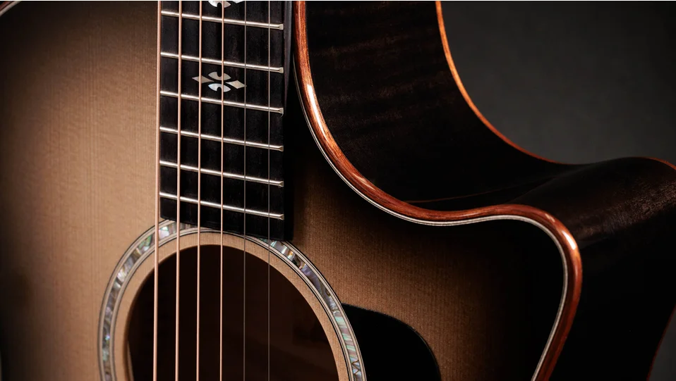 A charcoal edgeburst spruce top is one of several striking aesthetic touches on this cutaway Grand Auditorium 614ce Special Edition. The body’s figured maple back and sides sport a glossy, transparent light black color finish that reveals the figure in a subtle way and transitions smoothly into the top’s dusky edgeburst. Richly grained sapele binding adds a woody visual counterpoint. Tonally, the maple/spruce tonewood pairing yields a clear, balanced voice with a pleasing blend of brightness and warmth and responds well to a player’s touch. Voiced with Taylor’s V-Class bracing, this guitar will sing beautifully in tune from any fretting position and resonate with impressive sustain. Premium Gotoh 510 tuning machines in antique chrome feature an ultra-precise 21:1 gear ratio for smooth pitch control. Other visual details include a trans light black/ satin-finish neck, pale green abalone “Reflections” fretboard/peghead inlays, a single-ring green abalone rosette, ebony bridge pins with green abalone dots, and a black pickguard. The guitar comes with stage-ready ES2 acoustic electronics and ships in a deluxe hardshell case.