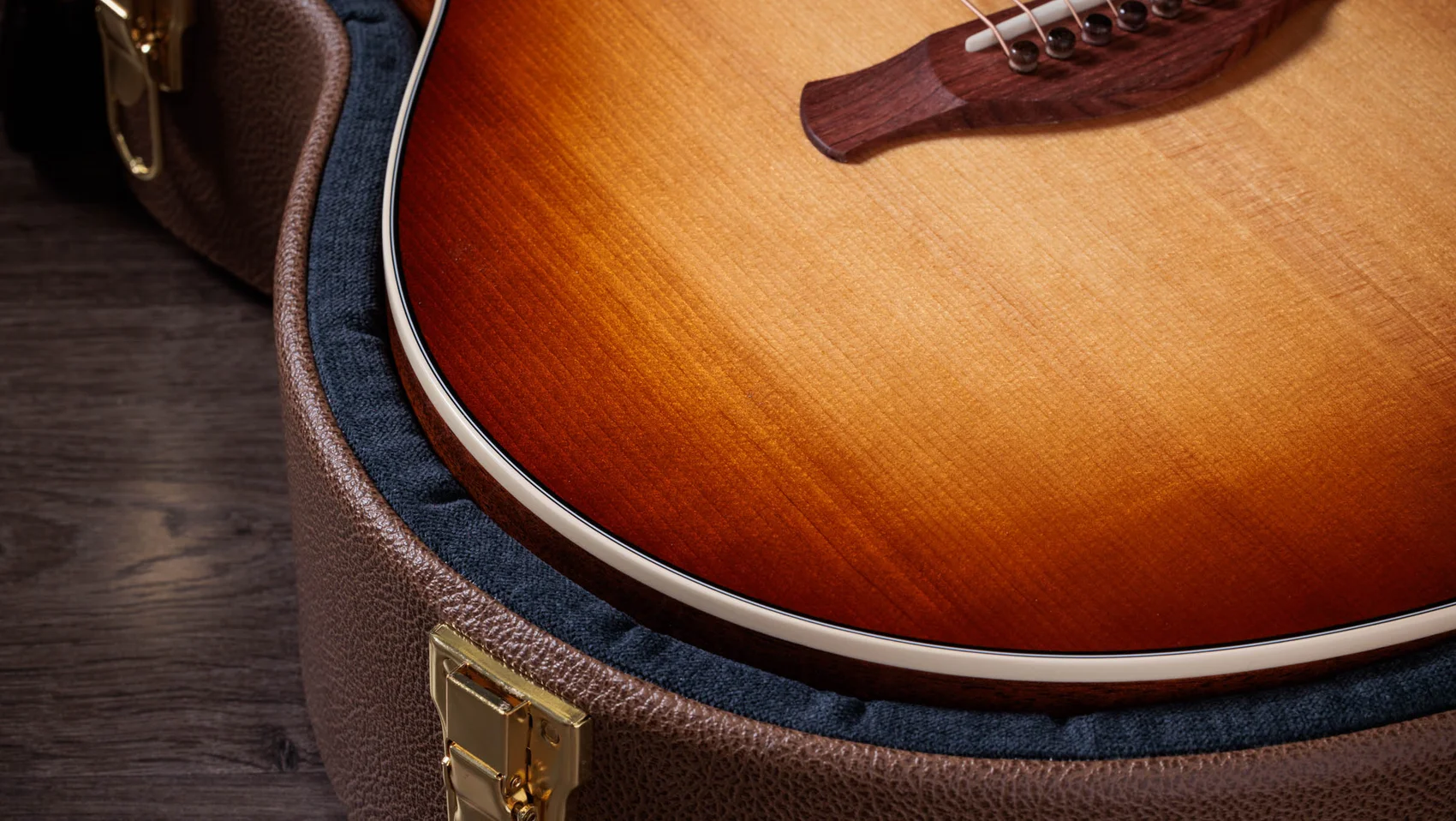 Combining striking looks with a warm, heritage-inspired voice, the Gold Label 514e SB offers fresh musical possibilities for players of all styles. This non-cutaway Super Auditorium acoustic-electric features back and sides of solid mahogany, a torrefied Sitka spruce top and a fanned variant of our tone-enhancing V-Class bracing, adding up to a woody, rich midrange character that blends power with old-school vibes. Players will notice a dry, focused sonic quality as well as a dash of aged-in depth and sweetness thanks to our proprietary roasting process for the soundboard. As a Gold Label model, this Super Auditorium also features our new Action Control Neck, which incorporates a long-tenon joint for improved resonance and quick, easy adjustability to string height. Visual cues include cream-colored binding with matching Crest fretboard inlays and rosette, a firestripe pickguard, nickel tuning machines, a Curve Wing bridge in Honduran rosewood with matching pins, and a sunburst top treatment with a full-body gloss finish. It ships with LR Baggs Element VTC electronics and a deluxe hardshell case with a British Cocoa exterior.