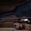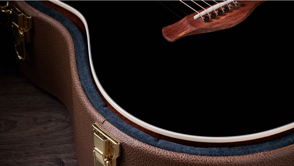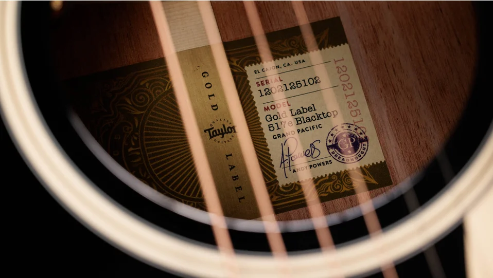 Showcasing the Gold Label Collection’s unique design details, this model features a modified headstock with an angled back cut and script-style Taylor logo inlay. Exuding the classic styling of mid-20th-century acoustics, it features a cream-colored pickguard with a distinct shape that contrasts stylishly with its blacktop finish. The appointment package also includes a Honduran rosewood Curve Wing bridge with Indian rosewood bridge pins, cream-colored Crest inlays on the fretboard and peghead, cream body binding, and a cream single-ring rosette. Outfitted with Taylor nickel tuners and LR Baggs Element VTC electronics, the Gold Label 517e ships in a British Cocoa deluxe hardshell case.