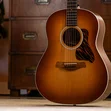 Showcasing the Gold Label Collection’s unique design details, this guitar features a modified headstock with an angled back cut and script-style Taylor logo inlay and a firestripe pickguard. A cream-colored pickguard is also available for this model. Its appointment package includes a Honduran rosewood Curve Wing bridge with Indian rosewood bridge pins, cream-colored Crest inlays on the fretboard and peghead, cream body binding, and a cream single-ring rosette. Outfitted with Taylor nickel tuners and LR Baggs Element VTC electronics, the Gold Label 517e ships in a British Cocoa deluxe hardshell case.