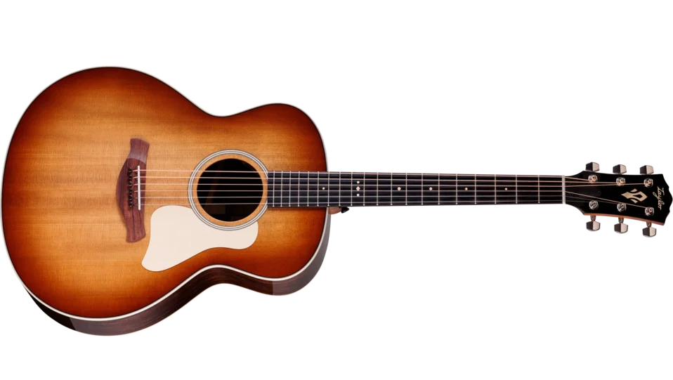 Boasting a visual aesthetic to mirror its old-school sonic personality, the Gold Label 714e SB features a golden-brown sunburst top accented with an array of cream-colored appointments. Solid Indian rosewood back and sides are paired with a torrefied Sitka spruce top in a Super Auditorium body, which is slightly longer and has a wider lower bout than our signature Grand Auditorium—while offering comparable musical versatility. This model serves up an open, expansive sound marked by deep lows, rich trebles, blooming overtones and played-in character right out of the box. Fanned V-Class™ bracing contributes to an exceptionally warm, resonant, powerful sound. A slender long-tenon Action Control Neck™ provides a hand-friendly playing experience while enabling on-the-fly string-height adjustments. Design elements exclusive to the Gold Label Collection include a distinctive pickguard shape and a modified headstock with an angled-back cut and script-style Taylor logo. Visual details include a Honduran rosewood Curve Wing bridge with Indian rosewood bridge pins, along with a cream-colored rosette, pickguard, binding and matching Crest fretboard inlays—all set against a full-body gloss finish. Outfitted with LR Baggs Element VTC electronics and Taylor nickel tuners, the Gold Label 714e SB ships in a Taylor deluxe hardshell case with a British Cocoa exterior.