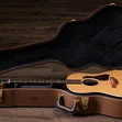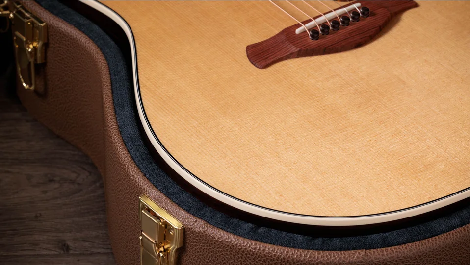 Appointments include a Curve Wing bridge in Honduran rosewood with matching bridge pins, cream-colored binding and a matching single-ring rosette, Crest inlays, our newly modified headstock shape, a firestripe pickguard, and a full-body gloss finish. It ships with LR Baggs Element VTC electronics and a deluxe hardshell case with a British Cocoa exterior.