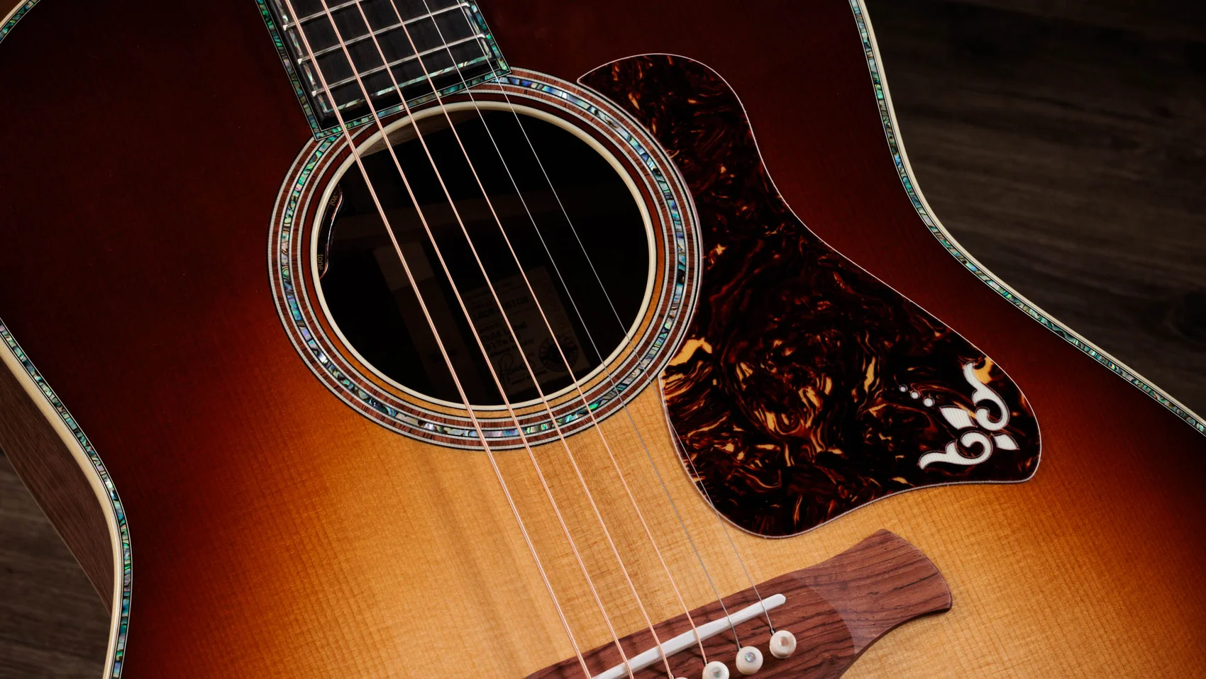 Other aesthetic touches include a golden-brown “Teardrop Sunburst” top, a full-body gloss finish, new paua/mother-of-pearl Continental Deluxe inlays, a single-ring paua/Honduran rosewood rosette, a Honduran rosewood curve wing bridge, Indian rosewood bridge pins, grained ivoroid binding, and paua fretboard and top purfling. Equipped with LR Baggs Element VTC electronics and Gotoh 510 antique gold tuners with ebony buttons, this model comes in a deluxe hardshell case with a British Cocoa exterior.