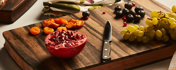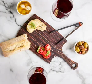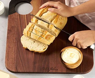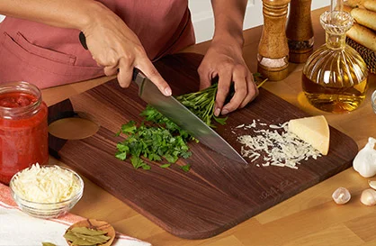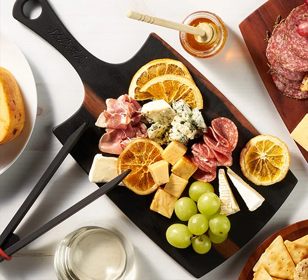 Our Café Series features an array of versatile kitchenware products: slim-profile cutting boards crafted in walnut and ebony with a corner cutout for easy handling, plus our compact serving paddles (in two wood options) and ebony serving tongs.