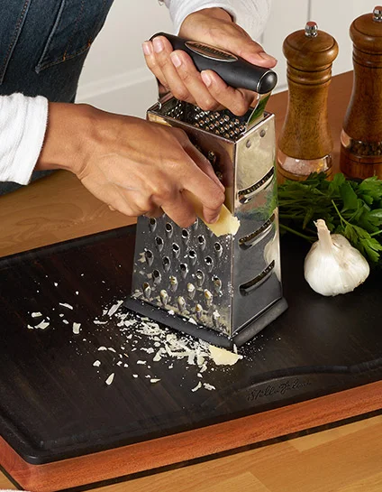 Our heavy-duty Pro Series reversible cutting boards showcase the beauty and durability of ebony. One side boasts ebony’s rich color variegation; the other side displays deep, dark hues. The sturdy three-ply construction features a middle layer of African sapele with a carved edge grip. Choose from small, large and slab sizes.