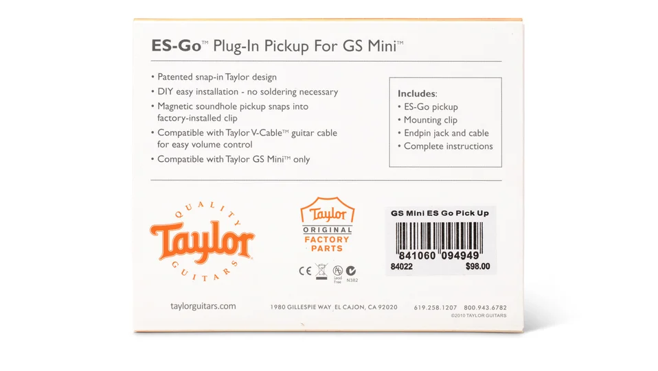 Designed by Taylor exclusively for the GS Mini, the ES-Go is a magnetic soundhole pickup that anyone can easily install in minutes with just a screwdriver. The pickup "floats" in the soundhole with the help of a connecting bracket that's pre-installed in every GS Mini. Just replace the guitar's endpin with the endpin jack and you'll be ready to plug in and play in no time. Please note the ES Go Pickup is only available for right-handed GS Mini guitars. Model #84022