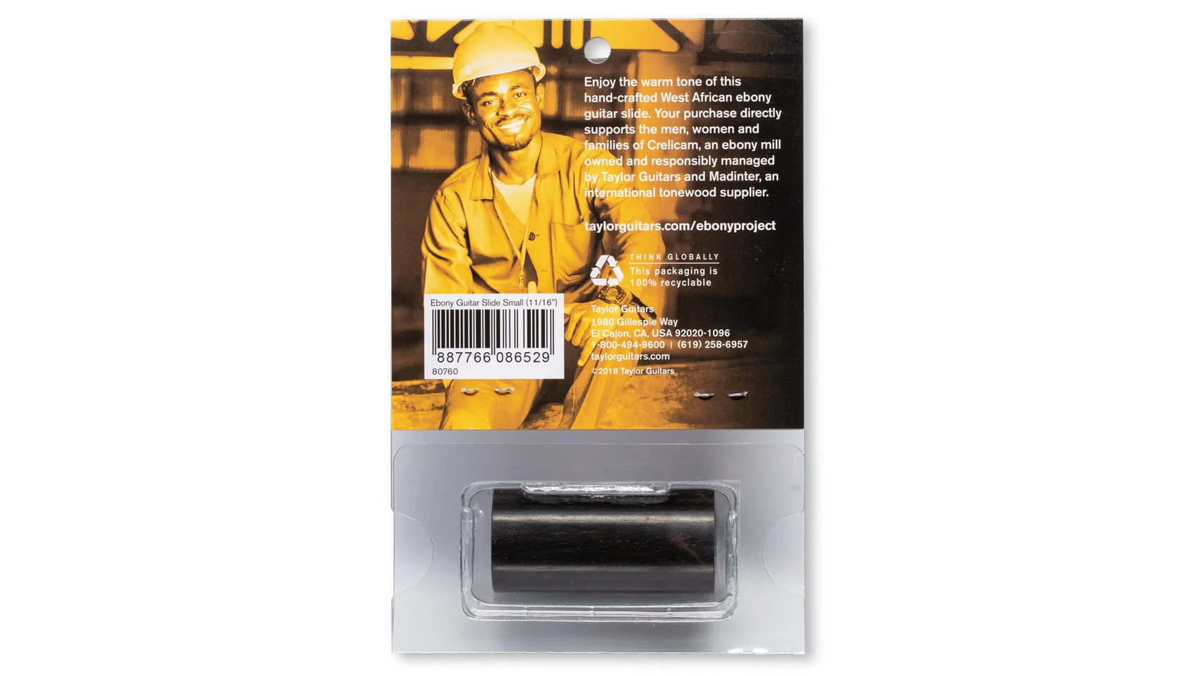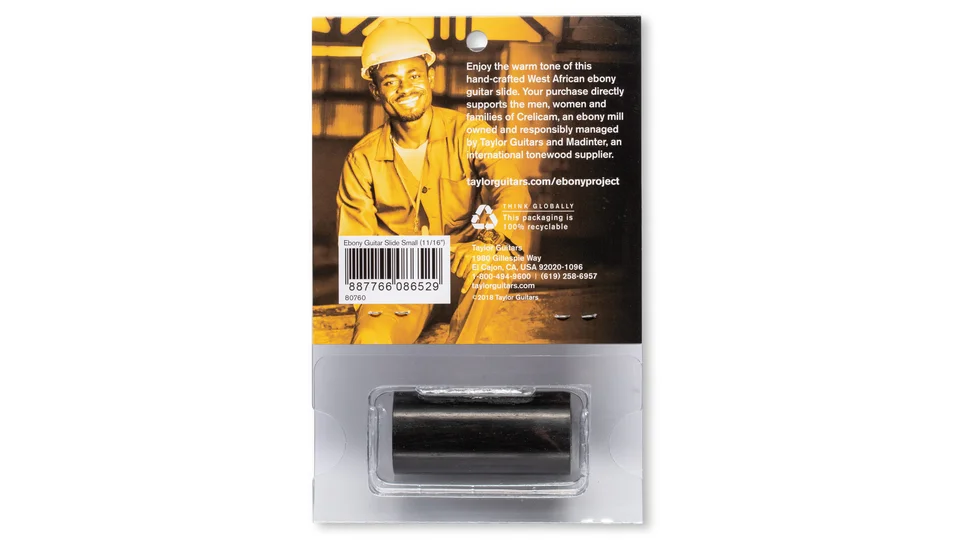 The Taylor ebony guitar slide, made from genuine Crelicam West African ebony, offers guitar players a unique alternative to traditional glass or metal slides. Available in four sizes, the ebony slide produces a warm, soft slide tone on both electric and acoustic guitars. By building slides with ebony that we're not able to use for guitars, we can generate more value for this precious resource and continue to work toward more sustainable practices and healthier ecosystems. Proceeds from the ebony slide support our replanting projects and other environmental endeavors. Available in sizes Small (11/16"), Medium (3/4"), Large (13/16"), and X-Large (7/8").