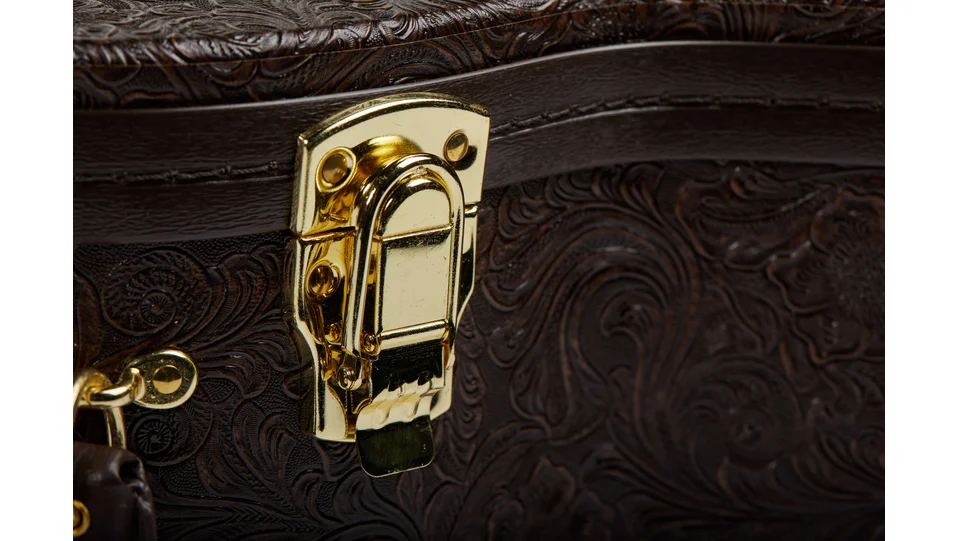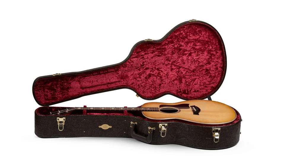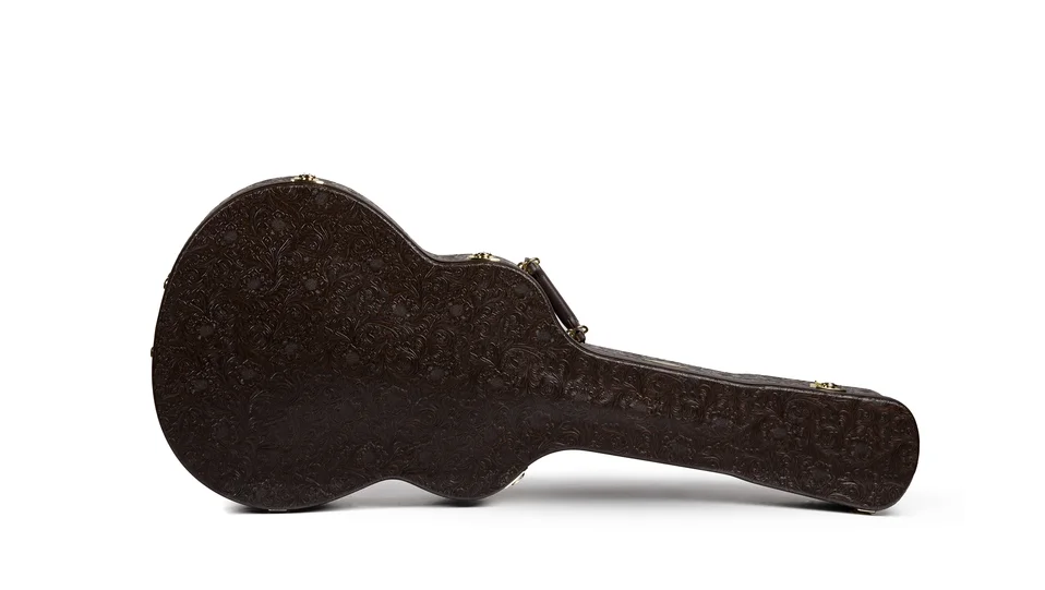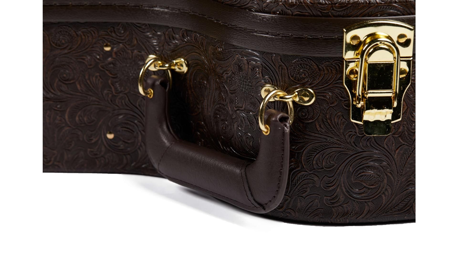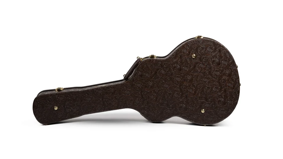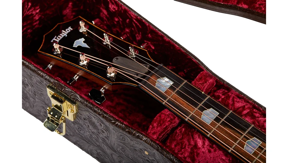 This hardshell Taylor case is covered in Western Floral textured dark brown vinyl over a 3-ply wooden structure. Your guitar is protected by foam padding covered in a plush crushed velvet lining. Double neck cradles and shape-specific body shaping provides your guitar with a snug, secure fit. Other features include a padded handle, brass-plated latches, bottom and side feet, and an accessories compartment. Model #86117.