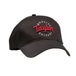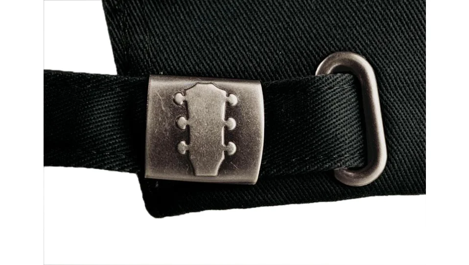 This pro-style chino twill cap with structured front and red/white round Taylor logo features an adjustable fabric strap with custom embossed metal peghead buckle closure. One size fits all. Black. Model# 00378