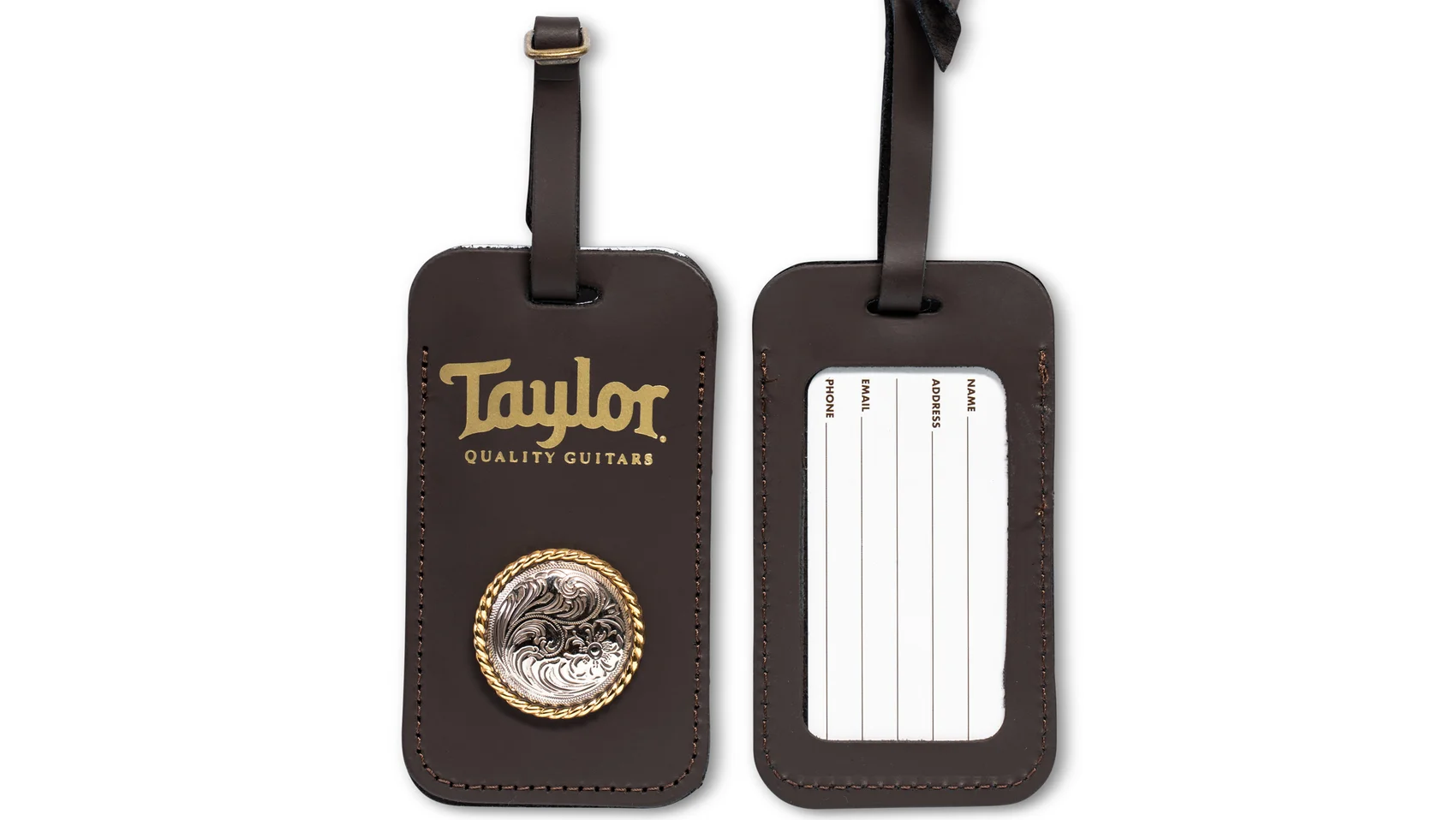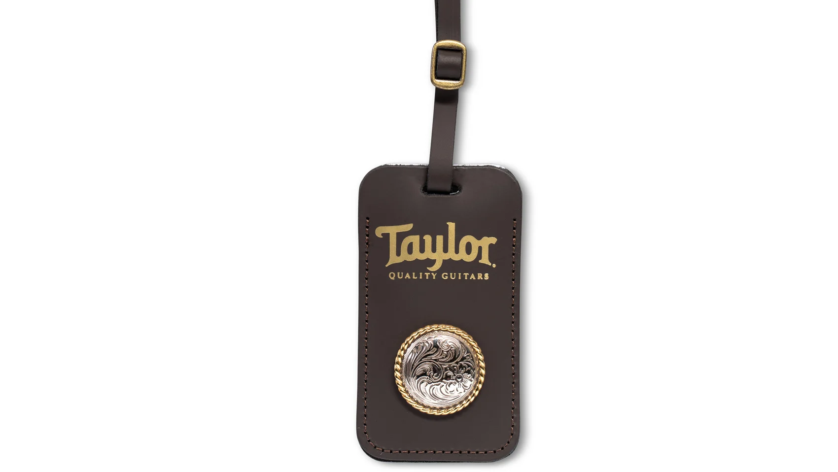 Home & Gifts - Taylor Leather Luggage Tag W/Concho, Chocolate Brown, Gold Logo | Taylor Guitars arrow icon-cart icon-email icon-facebook icon-g-plus icon-instagram No-Audio Pause icon-pin Untitled-1 icon-print icon-search icon-show-hide icon-tiktok icon-twitter Audio icon-youtube-play icon-youtube logo-mobile