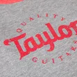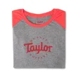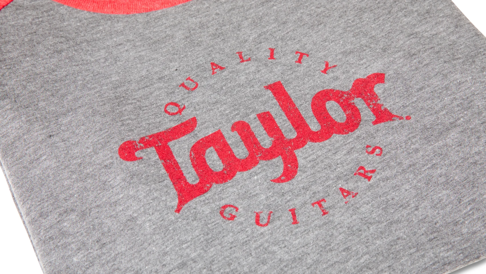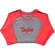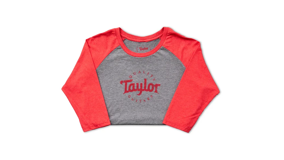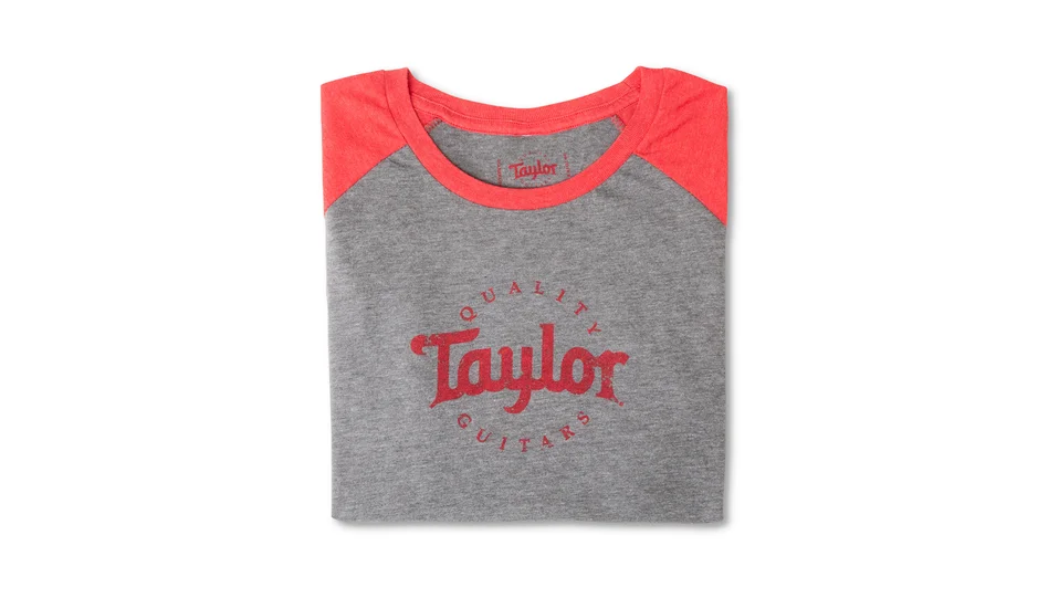 Ladies' baseball tee shirt with red and gray color pattern, featuring a distressed Taylor logo on the front. Slim cut with 3/4-length. Sizing up recommended. Available in sizes S–XL.