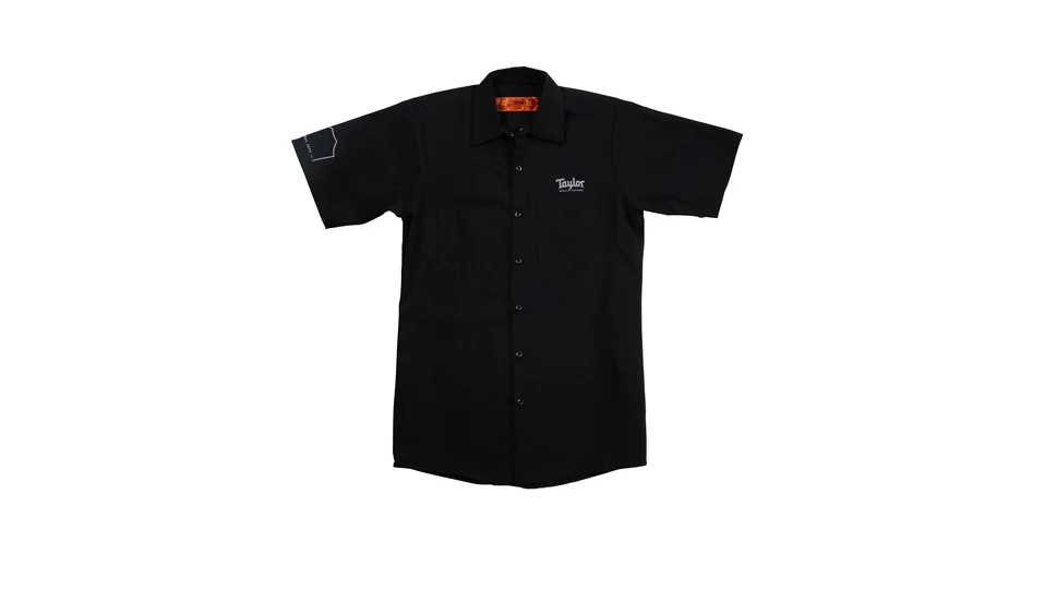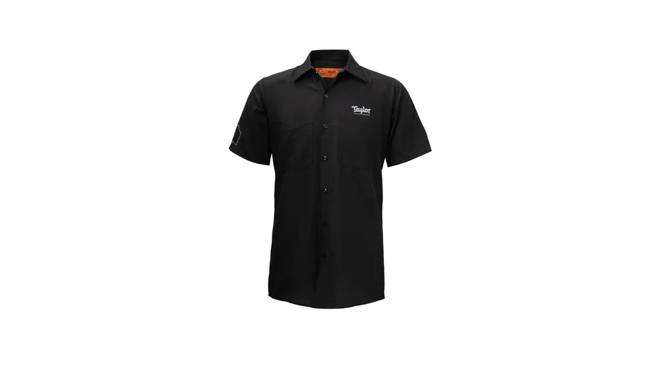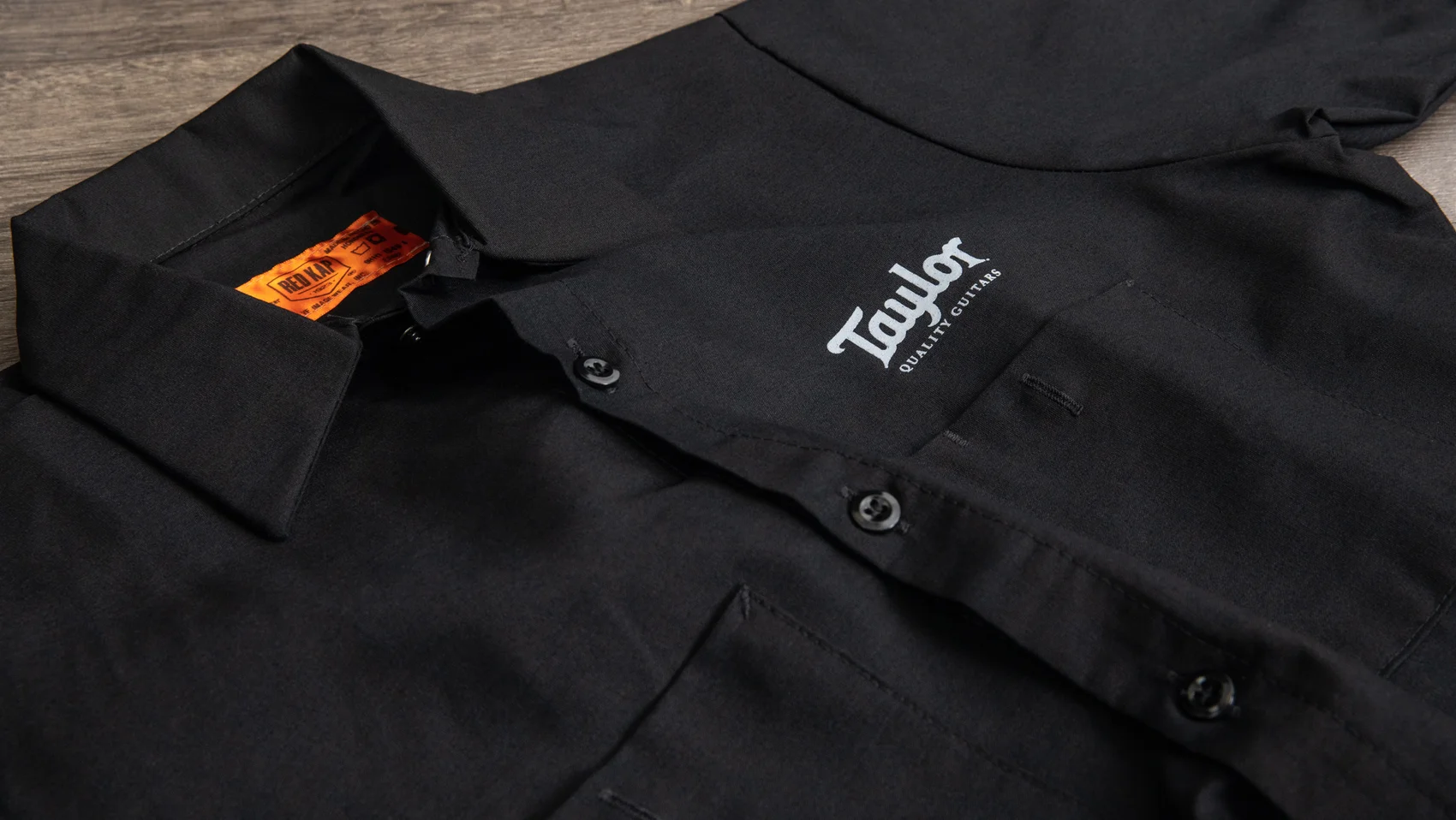 Taylor short-sleeve work-style shirt in black featuring Taylor emblem and crown headstock logo on sleeve. Sizes S-XXXL. Model #30710, 30711, 30712, 30713, 30714, 30715