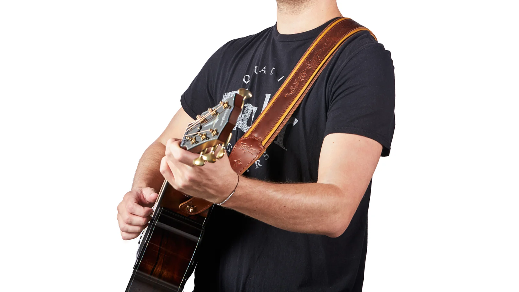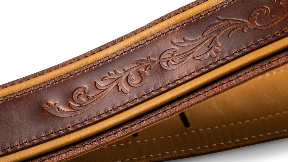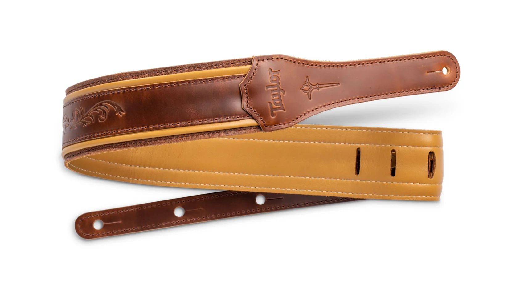 The Taylor Nouveau Leather Guitar Strap boasts an elegant multilayered medium brown color with butterscotch trim. Artfully detailed with our Nouveau inlay motif and an embossed Taylor logo, it's the perfect complement to virtually any acoustic guitar. At 2.5" wide, this strap is designed to provide hours of comfortable playing time thanks to extra shoulder support. Made in the USA. Taylor Model #4118-25