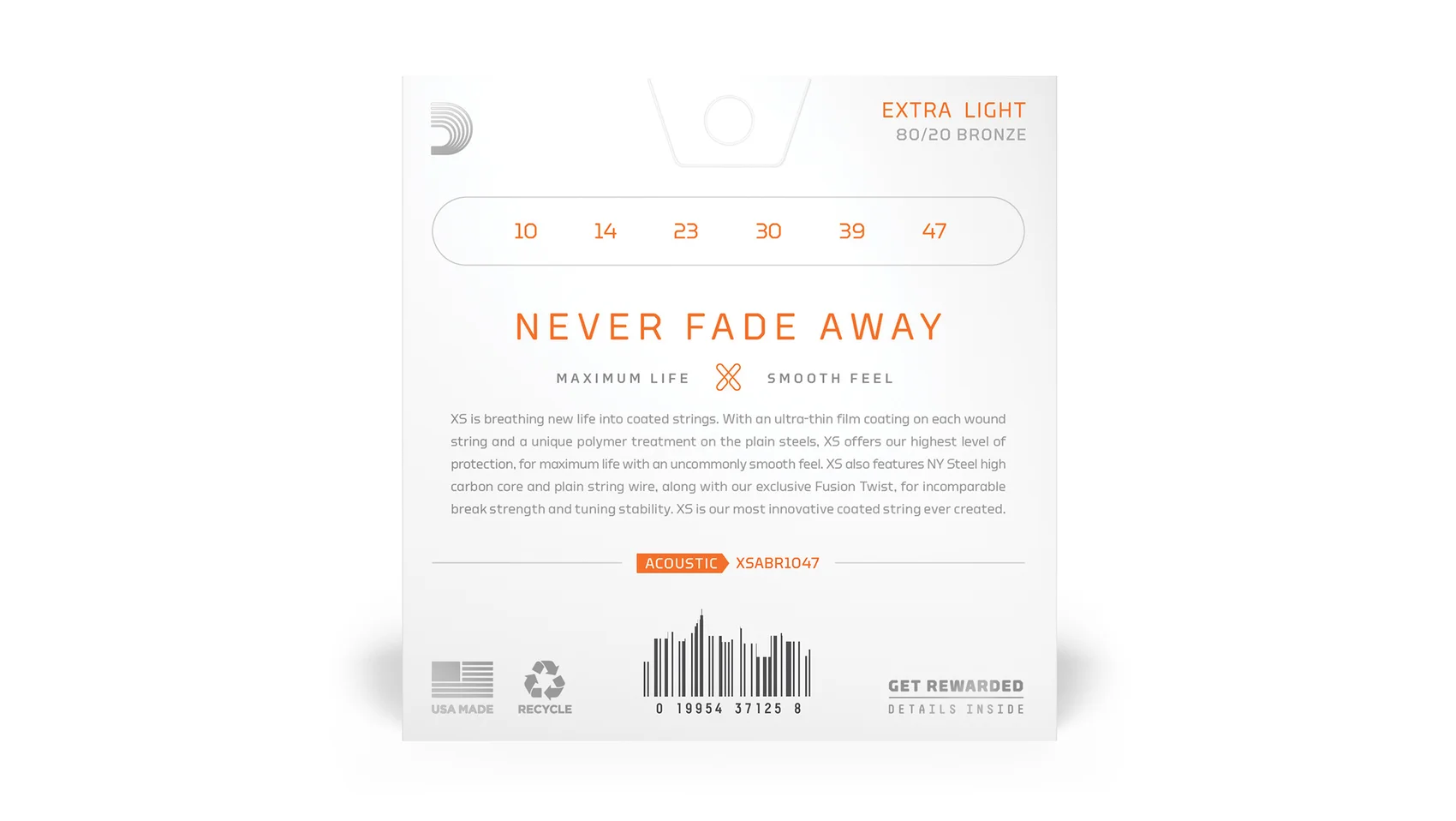 80/20 Bronze are our brightest acoustic guitar strings, made to give your tone an unparalleled shine. With the addition of our revolutionary XS coating, our bold, bright 80/20 strings obtain maximum life, with an uncommonly smooth feel. Made with a NY Steel core, 80/20 Bronze wrap wire, and Fusion Twist technology, these coated acoustic guitar strings have enhanced break strength and tuning stability over standard 80/20s, in addition to a dramatically increased lifespan. This 10-47 Extra Light gauge set is easy to play and easy to bend.
