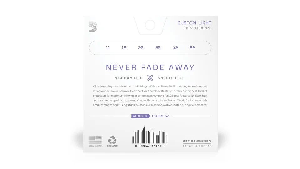 80/20 Bronze are D'Addario's brightest acoustic guitar strings, made to give your tone an unparalleled shine. With the addition of our revolutionary XS coating, our bold, bright 80/20 strings obtain maximum life, with an uncommonly smooth feel. Made with a NY Steel core, 80/20 Bronze wrap wire, and Fusion Twist technology, these coated acoustic guitar strings have enhanced break strength and tuning stability over standard 80/20s, in addition to a dramatically increased lifespan. This 11-52 Custom Light gauge set has slightly more volume and projection than Extra Light, while still being easy to play.