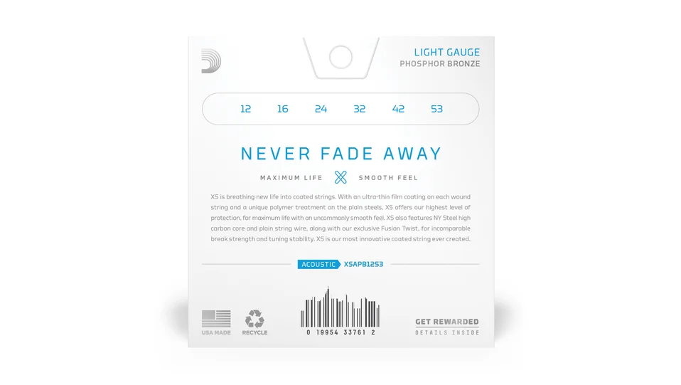 Born from D'Addario's greatest breakthrough in string innovation, XS Phosphor Bronze strings have the longest life of any D’Addario acoustic guitar string. The XS coating gives D'Addario's warm, balanced phosphor bronze strings maximum life, with an uncommonly smooth feel. Made with a NY Steel core, phosphor bronze wrap wire, and Fusion Twist technology, XS coated acoustic guitar strings have incomparable break strength and tuning stability, in addition to their dramatically increased lifespan. 12-53 Light strings are our most popular acoustic gauge, providing a nice balance of playability and tone.