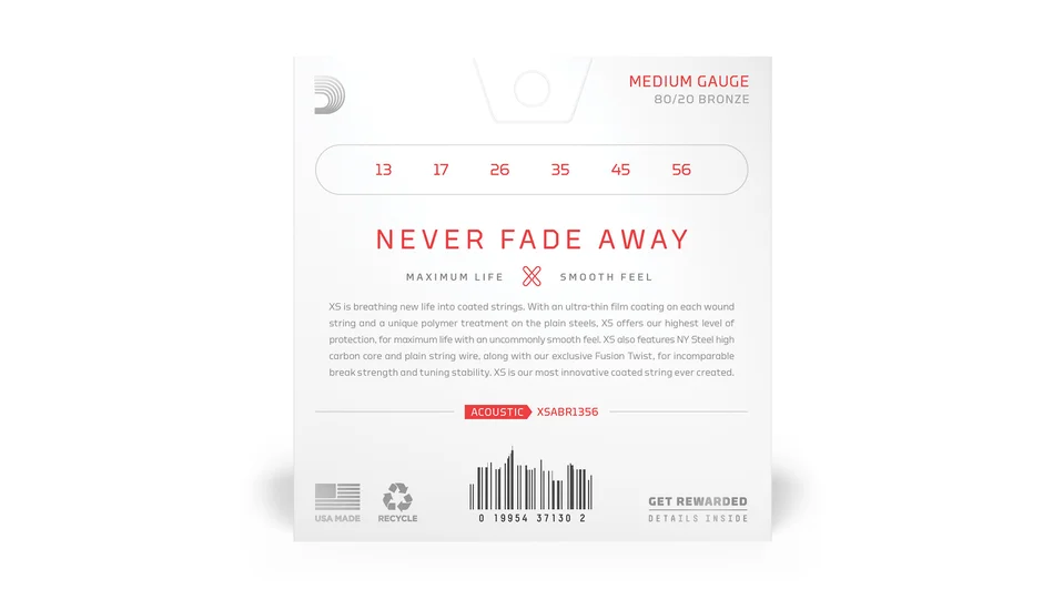 80/20 Bronze are D'Addario's brightest acoustic guitar strings, made to give your tone an unparalleled shine. With the addition of our revolutionary XS coating, our bold, bright 80/20 strings obtain maximum life, with an uncommonly smooth feel. Made with a NY Steel core, 80/20 Bronze wrap wire, and Fusion Twist technology, these coated acoustic guitar strings have enhanced break strength and tuning stability over standard 80/20s, in addition to a dramatically increased lifespan. This 13-56 Medium gauge set provides maximum volume and projection, with more tension and resistance.