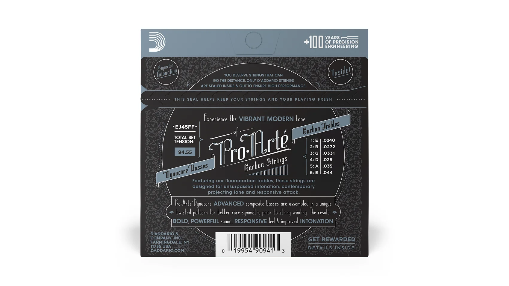 Pro-Arte’ Carbon is one of D’Addario’s most popular classical sets, providing superior intonation atop the perfect blend of tone, brightness, and projection. The twisted, multi-filament composite core of the Dynacore bass strings creates a brilliantly responsive attack with unparalleled intonation, while fluorocarbon trebles provide the brightest, most projecting tone of any D’Addario classical treble. The result is modern tonal projection and exquisite tonal character, beloved by classical players. This Normal Tension set is our best-selling tension, preferred for its balance of rich tone, comfortable feel, and dynamic projection.
