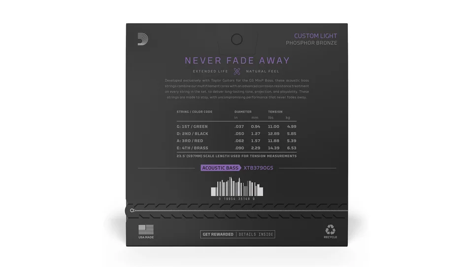 Since D'Addario introduced Phosphor Bronze acoustic guitar strings in 1974, they've been synonymous with warm, well-balanced tone—and since we developed this set exclusively with Taylor Guitars, there has been no better option for the GS Mini Bass. XT Taylor Mini Bass acoustic strings are constructed with a multi-filament core, phosphor bronze wrap wire, and an advanced corrosion resistance coating, affording tonal versatility with added resilience, excellent for a wide range of acoustic bass styles. This 37-90 Custom Light gauge set is made specifically for the Taylor GS Mini Bass and will also fit with other similarly-sized instruments.