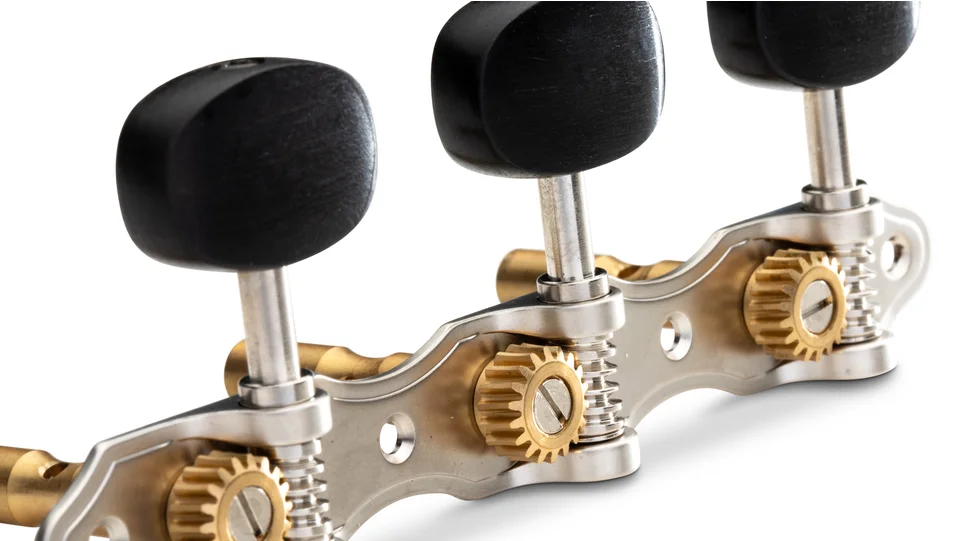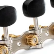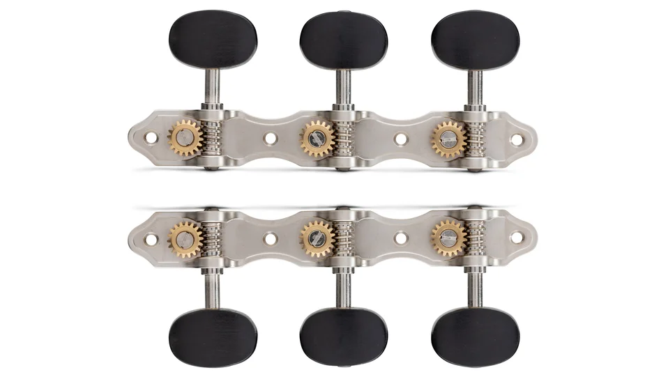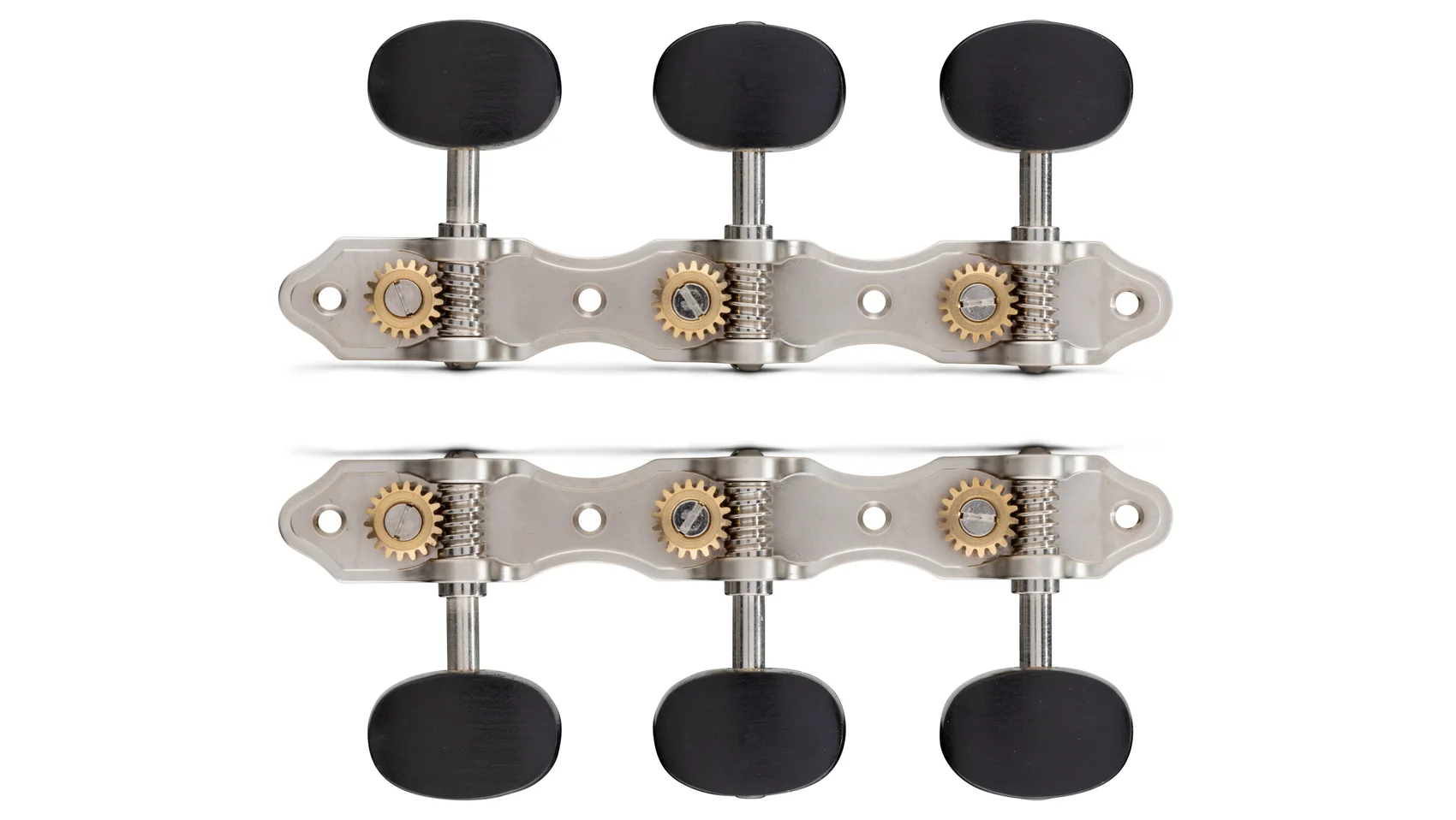 This full set of replacement tuners is built specifically for Taylor steel-string guitars with slotted headstocks. Featuring new ebony buttons, each set comes with three connected tuners on each side in a nickel finish, plus the necessary screws. An 18:1 gear ratio provides precise tuning. Taylor Model #80486